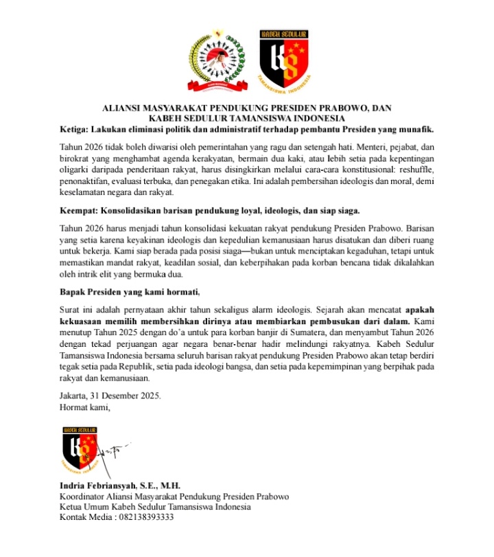 Jakarta, 31 Desember 2025 – Menutup tahun 2025, Aliansi Masyarakat Pendukung Presiden Prabowo, melalui Ketua Umum Kabeh Sedulur Tamansiswa Indonesia, Indria Febriansyah, S.E., M.H., menyampaikan surat terbuka yang berisi seruan ideologis dan sikap politik dalam menghadapi tahun baru 2026. Surat tersebut juga mengungkapkan suara nurani rakyat yang berdiri di atas garis perjuangan kebangsaan dan kemanusiaan.