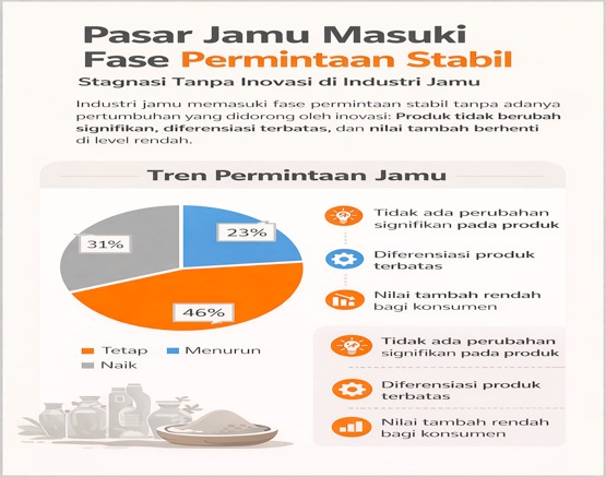 Namun, kondisi pasar justru stagnan. Sebanyak 46 persen pelaku usaha menyatakan permintaan relatif tetap, dan hanya 31 persen yang mengalami peningkatan penjualan. Pola ini menunjukkan bahwa industri jamu telah memasuki fase stable demand tanpa innovation-driven growth. Produk tidak berubah signifikan, diferensiasi terbatas, dan nilai tambah berhenti di level rendah.