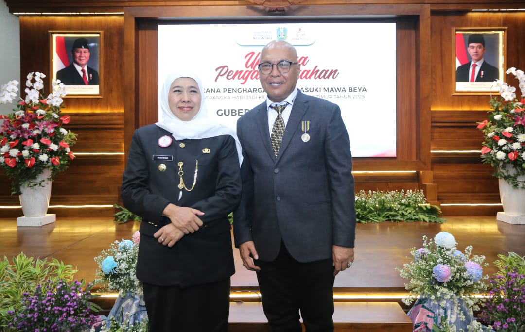 Kitabaru.com, Surabaya – Ketua Umum Persatuan Wartawan Indonesia (PWI) Pusat, Akhmad Munir, menerima Lencana Kehormatan Provinsi Jawa Timur “Jer Basuki Mawa Beya” dari Gubernur Jawa Timur, pada puncak peringatan Hari Jadi ke-80 Provinsi Jawa Timur, yang digelar di Gedung Negara Grahadi, Surabaya, Minggu (12/10/2025).