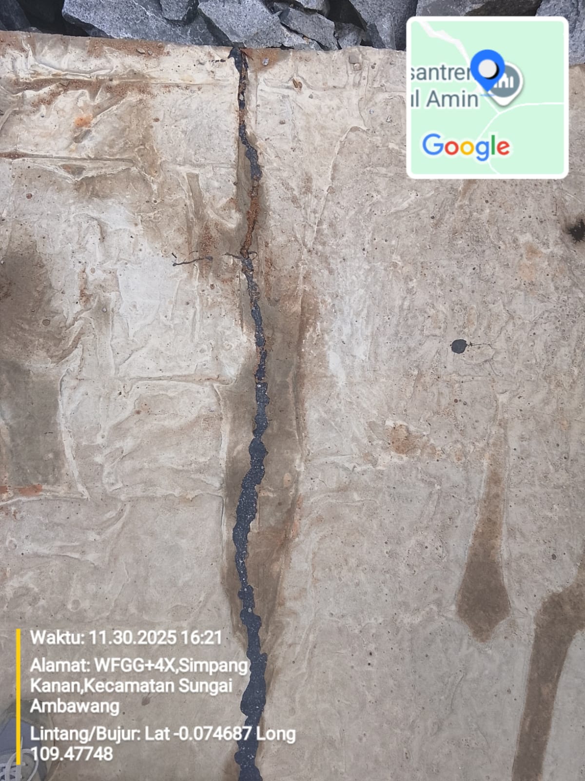 Kitabaru.com, Kubu Raya, Kalimantan Barat – Proyek Rekonstruksi Jalan Durian–Pasak Piang yang dibiayai dari APBD Kabupaten Kubu Raya Tahun Anggaran 2025 senilai Rp4.873.510.000,00 diduga tidak dikerjakan sesuai standar dan spesifikasi teknis konstruksi. Temuan tim investigasi media menemukan keretakan pada banyak titik lokasi pekerjaan, yang kemudian ditutupi dengan ter aspal hitam tanpa melalui proses perbaikan struktural.